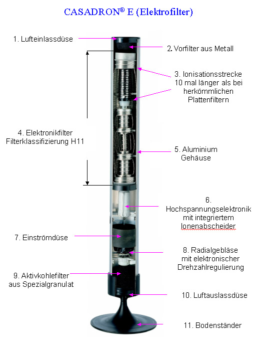Der integrierte Abscheider für überschüssige Negativ- und Positiv- Ionen hat für den Menschen den Vorteil, dass keine überschüssigen Ionen in die Atemluft gelangen und das natürliche Ionengemisch nicht beeinträchtigt wird. Somit ist der CASADRON® in seiner Form, Wirkungsweise und Effektivität weltweit einmalig. 7. Einströmdüse Die Einströmdüse für den Ventilator ist aus schalldämmenden Material gefertigt. Dadurch wird die Geräuschentwicklung sehr stark vermindert.